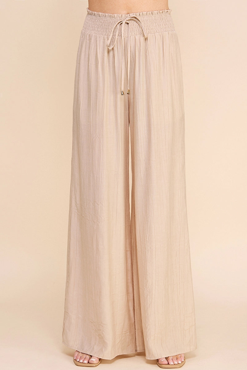 Breezy bamboo texture smocked waist flowy pants. Body size: contemporary Pattern: solid Length: full Style: high-waisted Fabric: rayon.